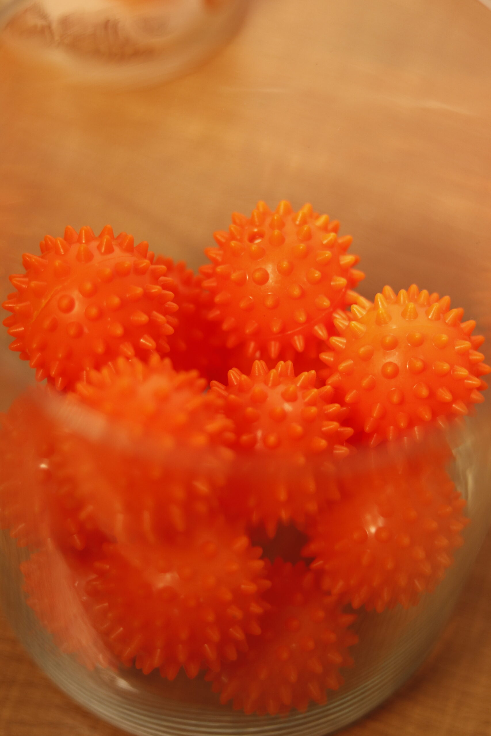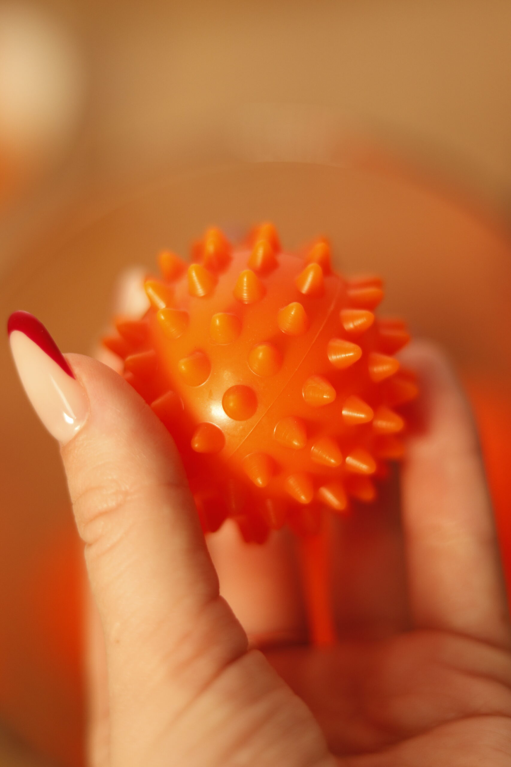 Każda piłka ma średnicę 5,5 cm, jest średnio twarda, z delikatnymi kolcami, które stymulują receptory skóry bez podrażnień i dyskomfortu.